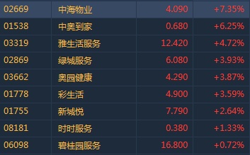 智通财经APP获悉,物业板块随大市走高,中海物业(02669)盘中高见4.18港元,创历史新高,领涨板块。截至14时36分,中海物业(02669)涨7.35%,中奥到家(01538)涨6.25%,雅生活服务(03319)涨4.72%,奥园健康(03662)涨3.87%,彩生活(01778)涨3.59%。