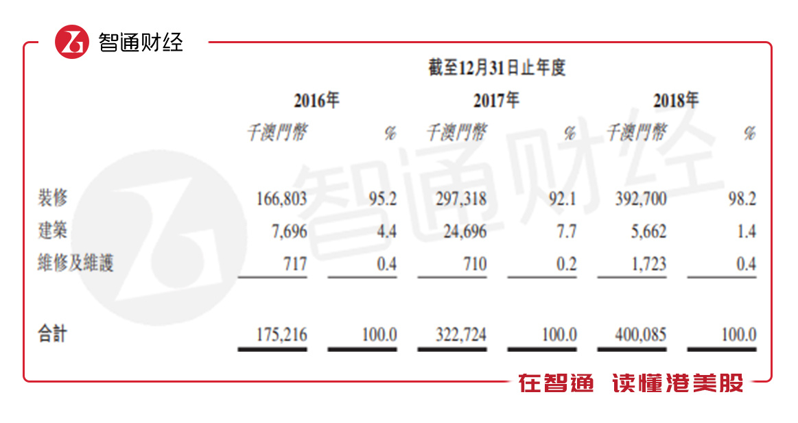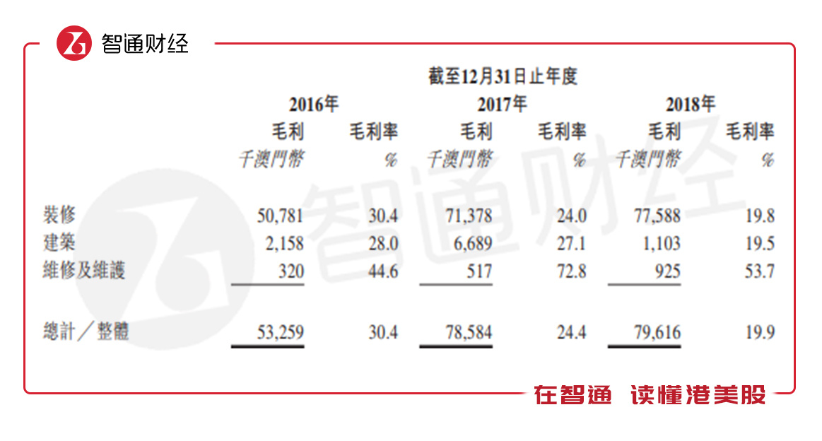 2018年该公司的装修业务收入3.93亿澳门币,近三年复合增长率53.4%,而建筑业务在2018年收入仅为0.057亿澳门币,同比下滑77%,收入占比下滑至1.4%,基本上财务收入增长贡献由核心业务提供。