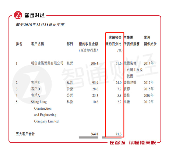 表面上看,虽然该公司增长的很快,但蕴含着潜在较大的客戶依赖风险。该公司客戶集中度非常高,2018年前五大客戶贡献收入达91.3%(往年占比均超过70%),其中最大客户收入贡献占比达51.6%,最大客户为民信建筑置业有限公司,和该公司无关联关系。