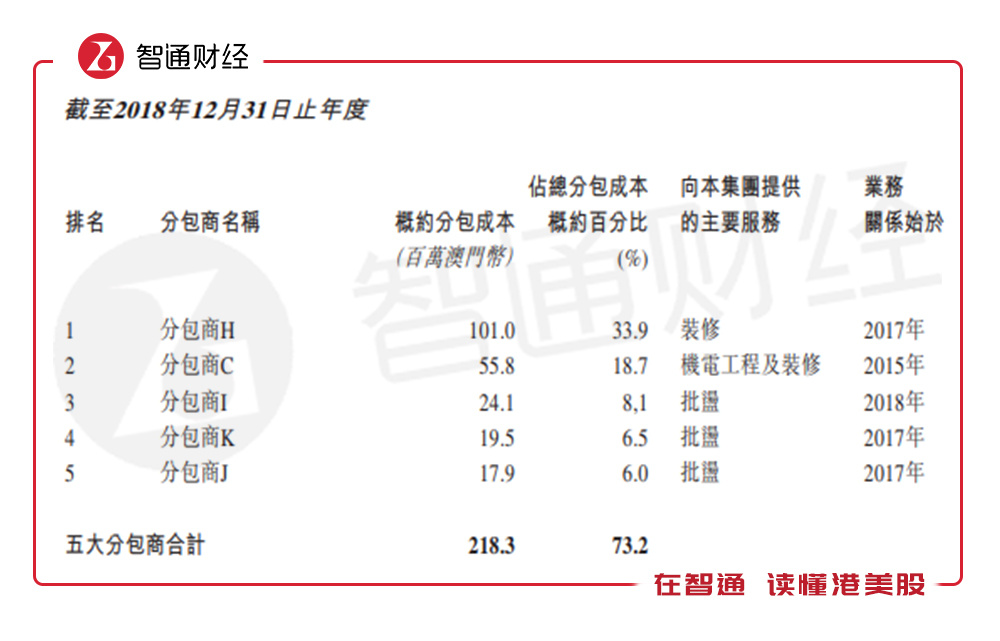 智通财经APP了解到,该公司毛利率下降主要由于服务成本的变化,而服务成本构成中,核心成本是分包费用,也就是给分包商的费用,2018年该项费用为2.98亿澳门币,占比服务成本93%。值得注意的是,该公司的分包商费用中,集中度非常高,2018年前五大分包商费用占比达73.2%,具有较高的经营性风险。