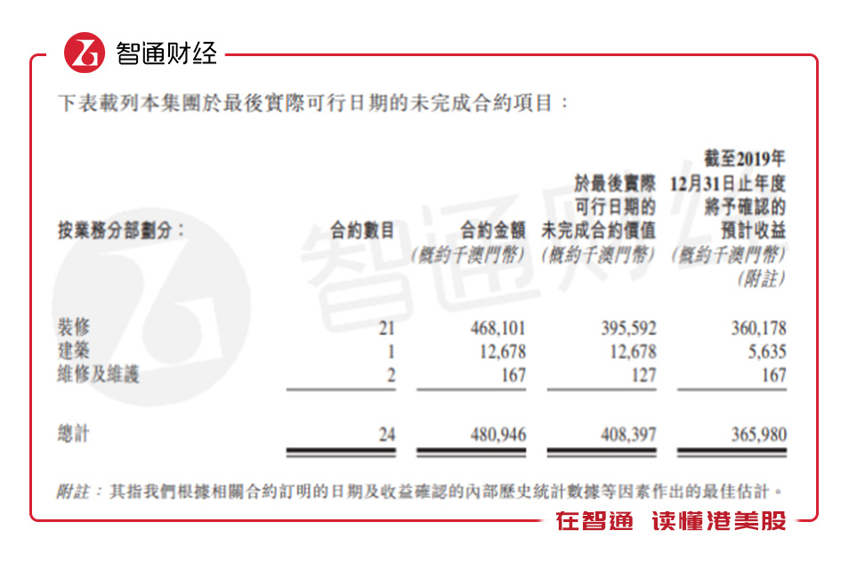 截止目前,该公司共有24个未完工项目,合约金额4.8亿澳门币,将在2019年确认收入3.66亿澳门币,其中21个为装修项目,合约金额4.68亿澳门币,将在2019年确认收入3.6亿澳门币。然而,该公司运营模式是客户按照工作进度付钱,前期各种原料费以及人工费均由公司自己先出。