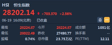 智通财经APP获悉,恒指早盘跳空高开726.1点或2.64%,报28224.87点,并全天维持高位运行,量能亦显著放大。截至收盘,恒生指数涨703.37点或2.56%,报28202.14点,全日成交额达1051亿。国企指数涨2.45%,报10764.7点,红筹指数涨1.93%,报4366.82点。