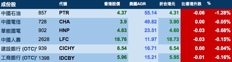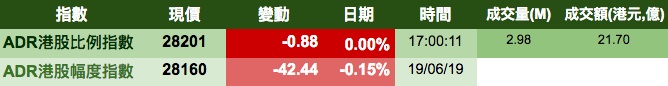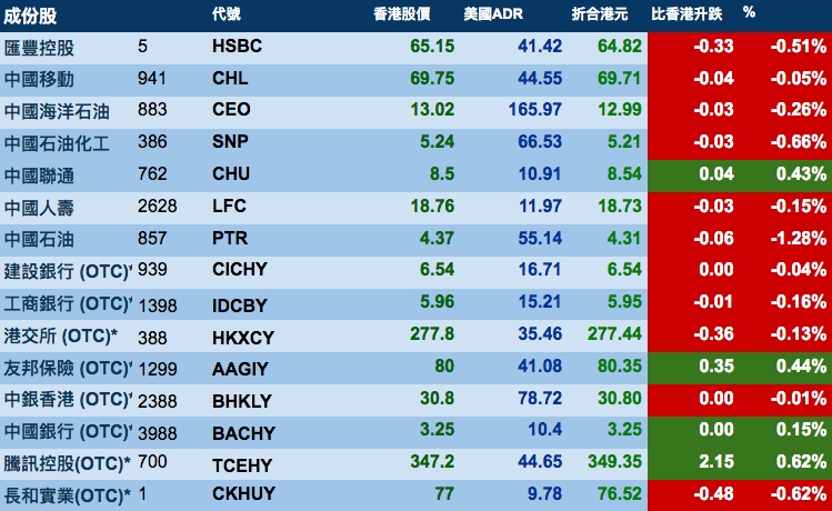 智通财经APP获悉,美股收市靠稳,但港股ADR指数全日无方向,按比例计算,收报28201点,跌0.88点。大型蓝筹股个别发展,汇丰控股收报64.82元,较港收市跌0.33元;腾讯控股收报349.35元,较港收市涨2.15元。