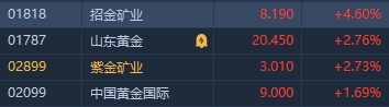 智通财经APP获悉,黄金股早盘悉数高开,截至发稿,招金矿业(01818)涨4.6%,山东黄金(01787)涨2.76%,紫金矿业(02899)涨2.73%。