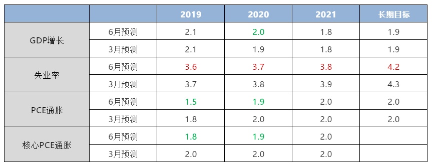 不确定性、弱通胀是本次联储措辞中担忧的方向。本次会议上联储对于经济本身的表述并未发生太大的变化,当然,这是由于在5月会议上联储对于经济表述已较为谨慎,本次会议延续了谨慎的措辞,更强调中经济中的“不确定性”。在经济预测上也是如此,相比3月的预测,联储对于GDP增速的预测变化不大,主要是下调了对于通胀的预期。