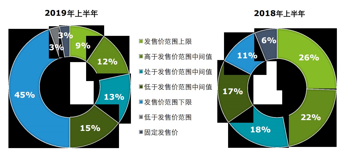 值得注意的是,受市况波动以及市场不明朗因素的影响,2019年上半年时,香港新股发售价定于下限的IPO比重由2018年上半年的11%大增至45%,直拉34个百分点。与此同时,在发售价上限发行的IPO比重也从2018年上半年的26%下降至2019年上半年的9%,即与去年相比,新股的整体上市估值有一定下调。
