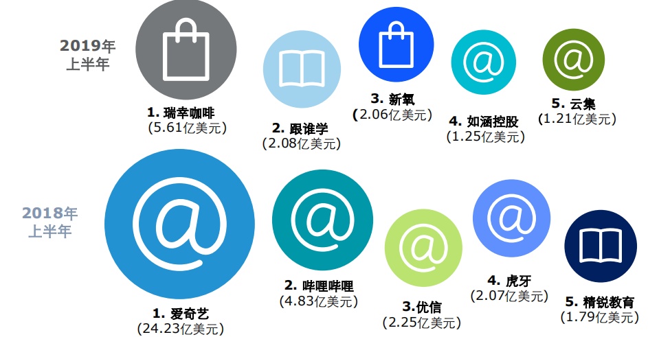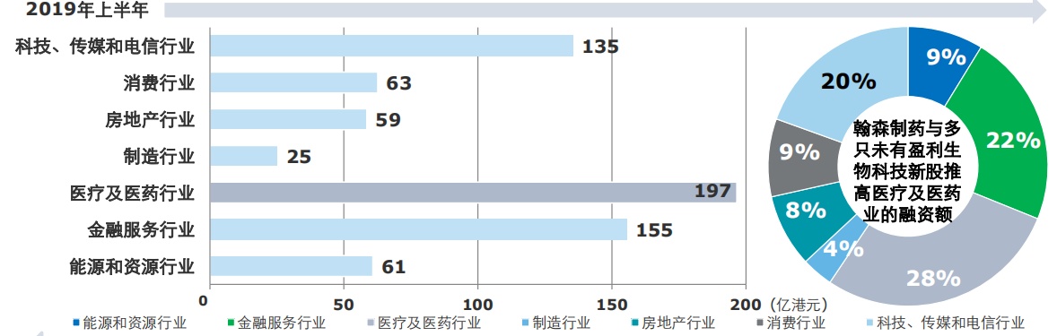 此外,受惠于港交所全新的上市制度,医疗及医药行业融资额在2019年上半年明显超前,高达197亿港元,而金融服务行业,以及科技、传媒和电信行业则分别以155亿港元、135亿港元的融资额排于医疗及医药行业之后。