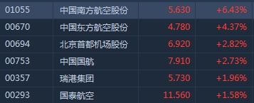 智通财经APP获悉,双重利好助力航空板块涨势延续,截至13时56分,南航(01055)涨6.43%,报价5.63港元,东航(00670)涨4.37%,首都机场(00694)涨2.82%,国航(00753)涨2.73%,国泰航空(00293)涨1.58%。