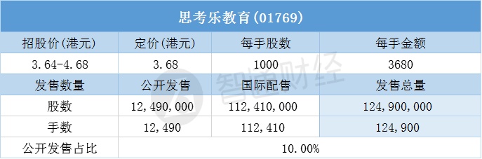 智通财经APP获悉,6月20日,思考乐教育(01769)配售结束。配售招股价区间为3.64-4.68港元,最终定价3.68港元,每手3680港元。