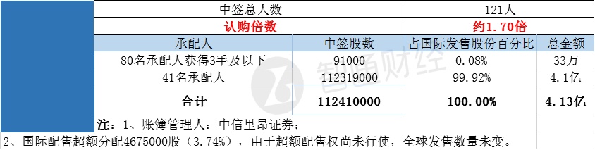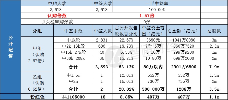 其中,公开配售申购人数3613,一手中签率100%,认购倍数约1.57倍。