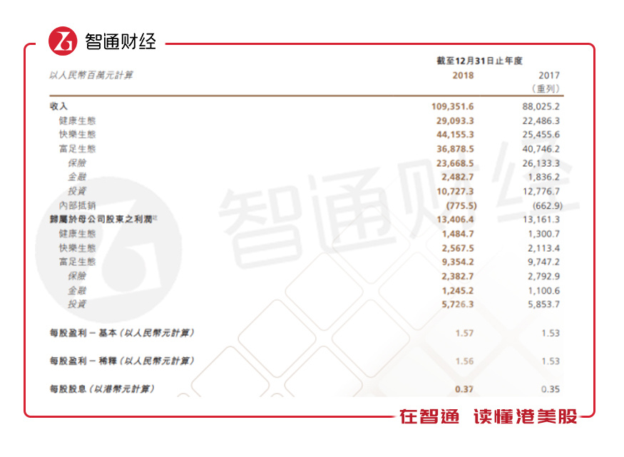 最后是富足生态,复星国际将该板块重分类,将原保险和金融板块拆分成为保险板块和金融板块,包括保险、金融和投资板块。2018年该板块收入368.785亿元,同比下滑9.49%,股东净利润93.542亿元,同比下滑4.03%,不过金融业务实现收入及净利润增长分别为35.2%和13.1%。