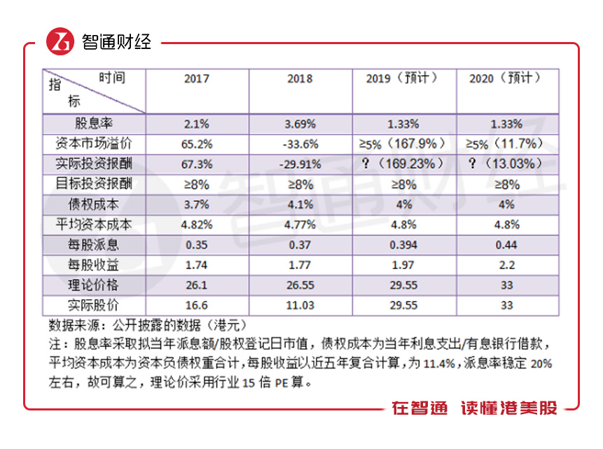 2017年恒指大牛,复星国际的成长得到体现,资本溢价65.2%,而2018年恒指走熊,也给优质股带来的估值的下杀,期间资本溢价-33.6%,不过若公司成长及盈利持续,资本溢价回报仍会非常可观。经智通财经测算,若理论价格成立,2019及2020年资本溢价将达到167.9%及11.7%。
