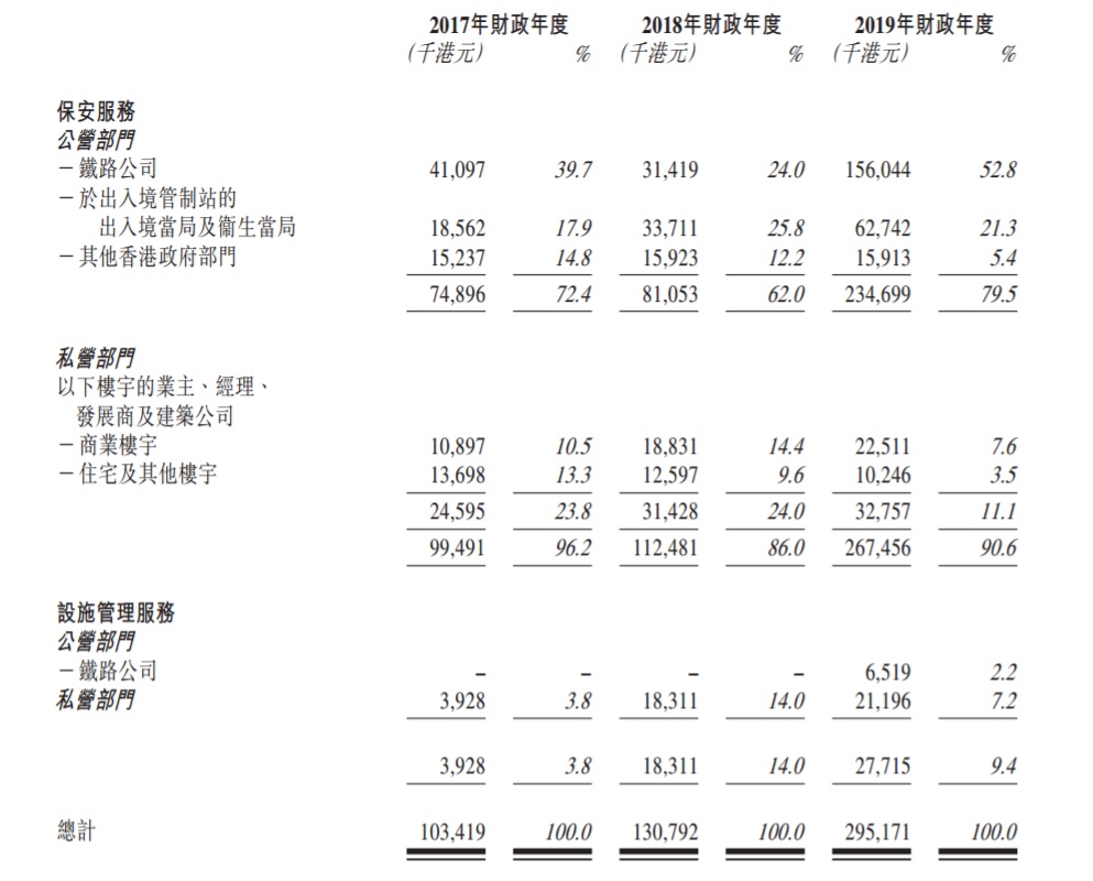 其公营部门的主要客户包括铁路公司、香港政府部门、教育及其他公共机构。其最大客户应占收入约41.1百万港元、31.4百万港元及162.6百万港元,分别占收入约39.7%、24%及55.1%。