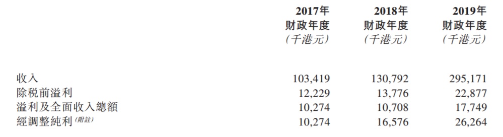 国际永胜集团的收入由2017财年的约103.4百万港元增加约26.5%至2018财年的约130.8百万港元,并进一步增加约125.7%至2019财年的295.2百万港元。其溢利及全面收入总额由2017财年的约10.3百万港元增加约4.2%至2018财年的约10.7百万港元,并进一步增加约65.8%至2019财年的17.7百万港元。