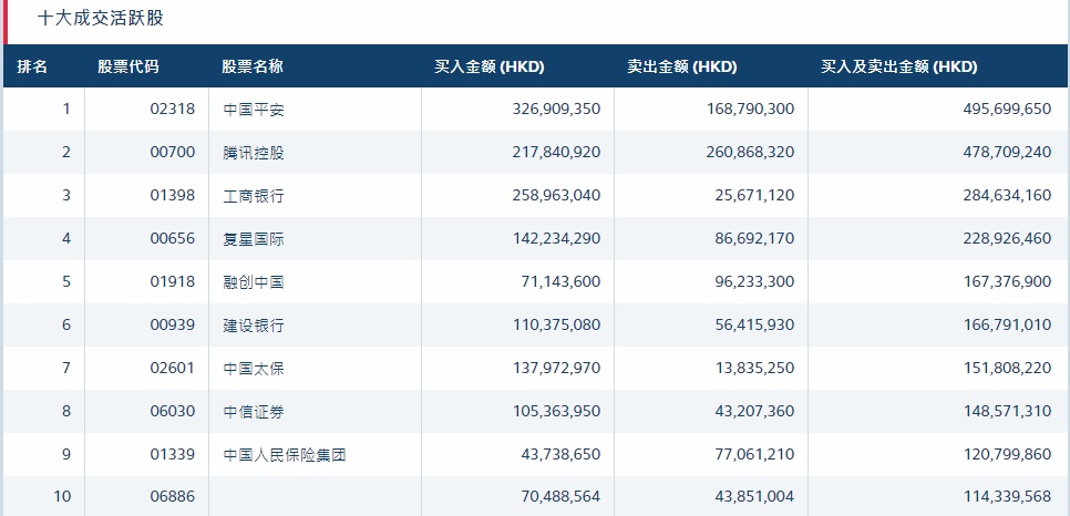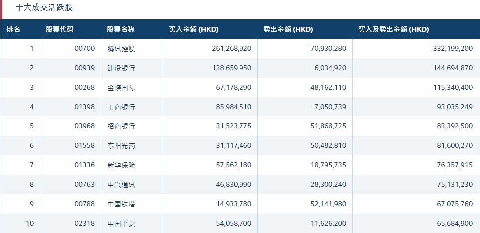 港股通(沪)十大活跃成交股