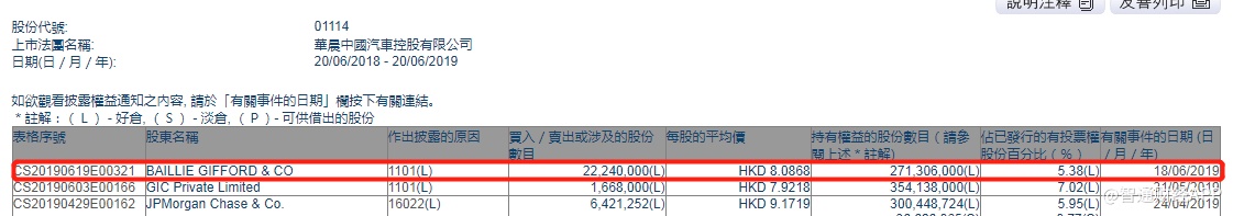 智通财经APP获悉,根据联交所资料显示,BAILLIE GIFFORD于6月18日增持华晨中国(01114)2224万股,每股作价8.09港元,总值约1.8亿港元,最新持股数目约2.71亿股,最新持股比例为5.38%。