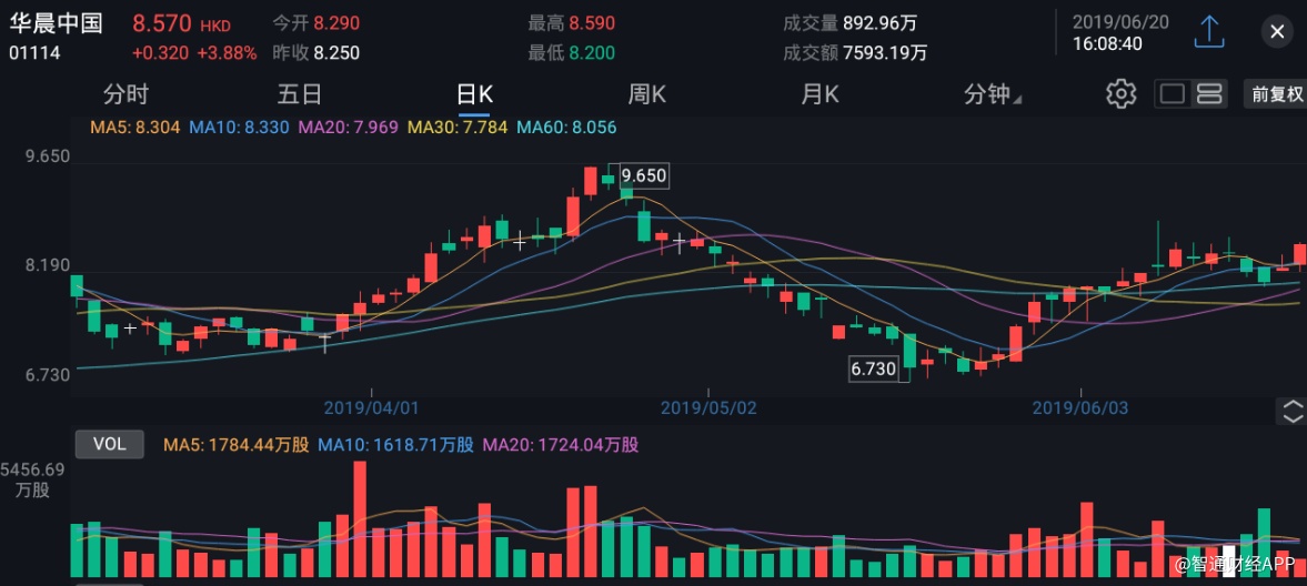 截至今日收盘,华晨中国(01114)涨3.88%,报8.57港元。