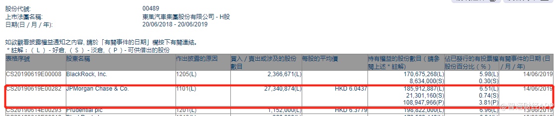 智通财经APP获悉,根据联交所资料显示,摩根大通于6月14日增持东风(00489)2734万股,每股作价6.04港元,总值约1.65亿港元,最新持股数目约1.85亿股,最新持股比例为6.51%。