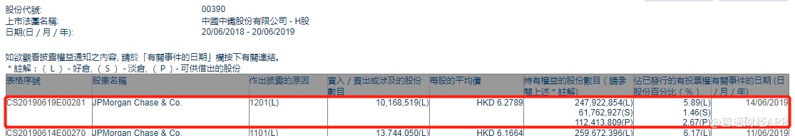 智通财经APP获悉,根据联交所资料显示,摩根大通于6月14日减持中铁(00390)1017万股,每股作价6.28港元,总值约6386.76万港元,最新持股数目约2.48亿股,最新持股比例为5.89%。