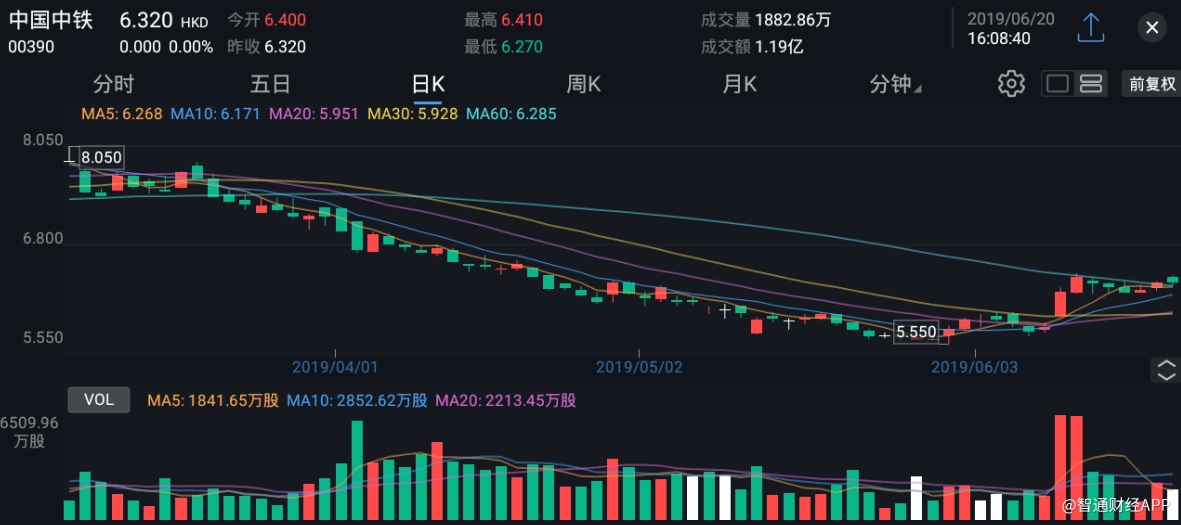 截至今日收盘,中铁(00390)无涨跌,报6.32港元。
