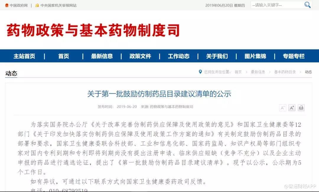 2018年12月29日,国家卫生健康委、国家发展改革委、教育部等12个部门联合印发《关于加快落实仿制药供应保障及使用政策工作方案》。《方案》明确,根据临床用药需求,自2019年6月底前,发布第一批鼓励仿制的药品目录,引导企业研发、注册和生产;自2020年起,每年年底前发布鼓励仿制的药品目录。
