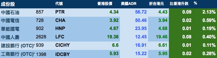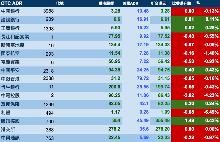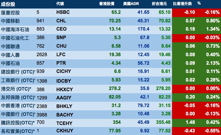 智通财经APP获悉,美股指标创新高,刺激港股ADR指数全日向好,按比例计算,收报28613点,升63.09点。大型蓝筹股个别发展,汇丰控股收报65.1元,较港收市跌0.1元;腾讯控股收报355.48元,较港收市涨1.48元。