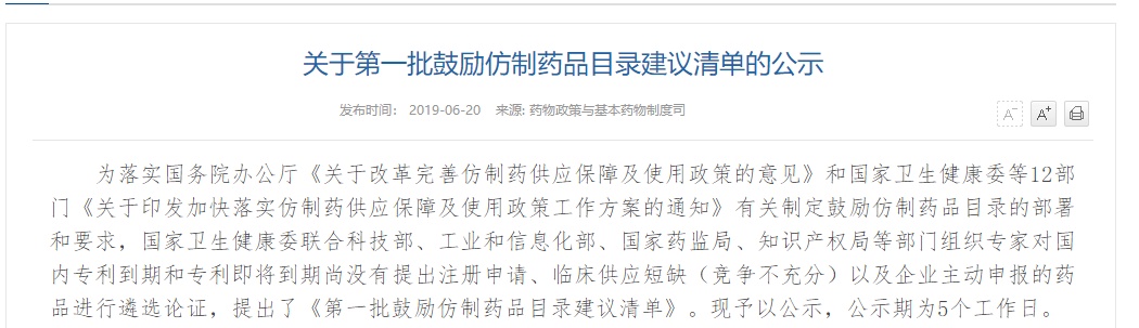 并要求2019年6月底前,发布第一批鼓励仿制的药品目录,引导企业研发、注册和生产。并根据临床用药需求,2020年起,每年年底前发布鼓励仿制的药品目录。所以,从时间节点看,此时发布目录都是原计划内的事。