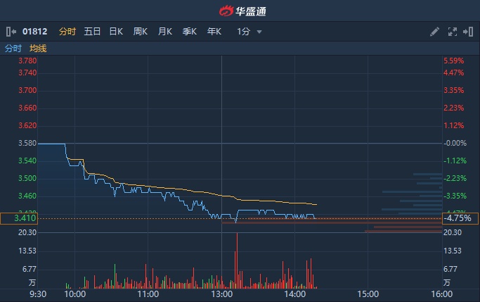 智通财经APP获悉,晨鸣纸业(01812)今日单边下挫,失守5日线。截至14时17分,跌4.75%,报3.41港元,成交额达1627万港元。