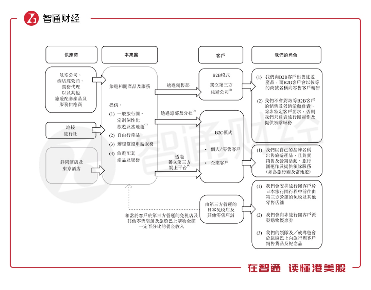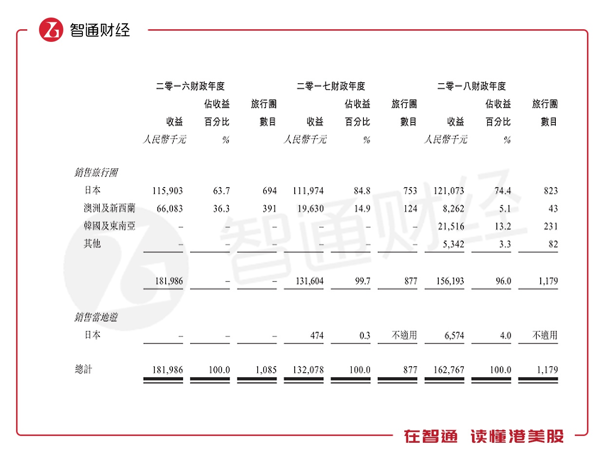 截至目前,公司主要业务包括:旅行团及当地游、自由行、签证申请服务、酒店业务、以及旅游配套产品及服务等5个部分。其中,公司所提供的旅行团产品包括日本、澳洲及新西兰等地,日本为最主要业务地区。
