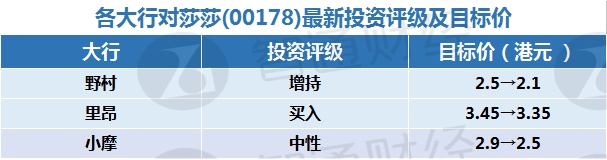 三、各大行对莎莎(00178)最新投资评级及目标价: