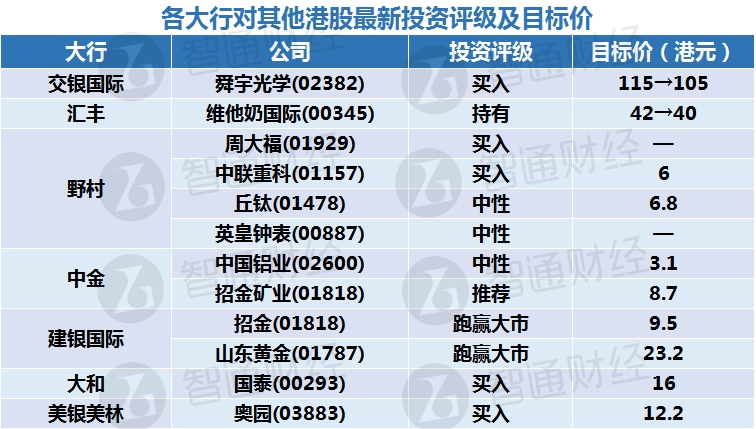 五、各大行对其他港股最新投资评级及目标价: