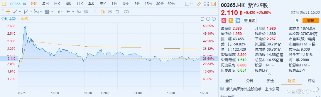 6月21日,紫光控股(00365)的一纸控股权转让公告,让投资者亢奋到一度将其拉升56%,但随后涨幅有所收窄,今日收报2.11港元,涨25.6%。