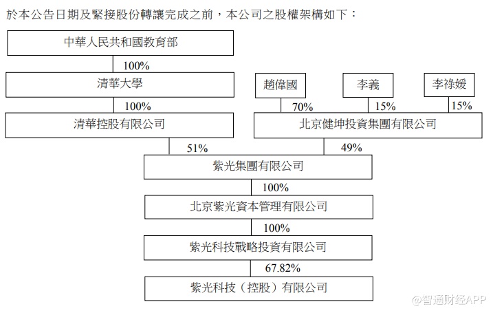 据智通财经APP了解,紫光控股是紫光集团唯一的海外上市平台,紫光集团通过其全资子公司紫光科技间接持有上市公司67.82%股权,紫光集团有两个股东,一个是清华控股,另一个是北京健坤投资集团有限公司,分别持股51%、49%。