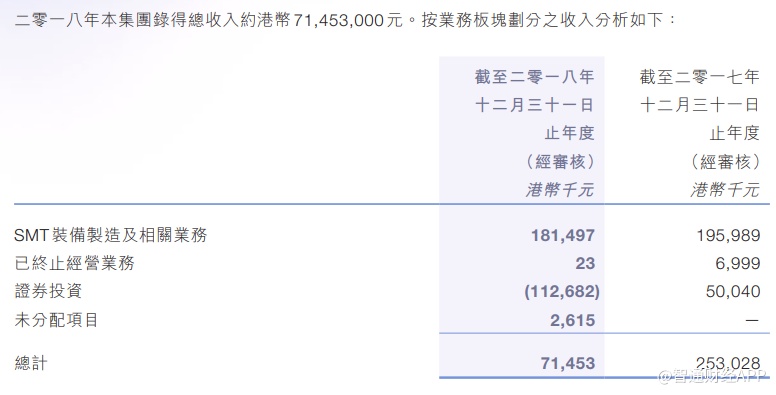 过去几年,公司的收入连续下滑,从2015财年的8.38亿港元一路下降至2018财年的7145.3万港元,去年虽然核心业务SMT装备制造收入同比增长34%,但受股市拖累的证券投资业务分部由盈转亏,加上终止融资租赁及保理业务,导致整体营业额降幅扩大至71.77%。