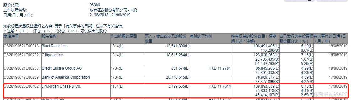 智通财经APP获悉,根据联交所资料显示,摩根大通于6月17日增持华泰证券(06886)380万股,每股作价11.76港元,总值约4468.8万港元,最新持股数目约1.4亿股,最新持股比例为8.13%。