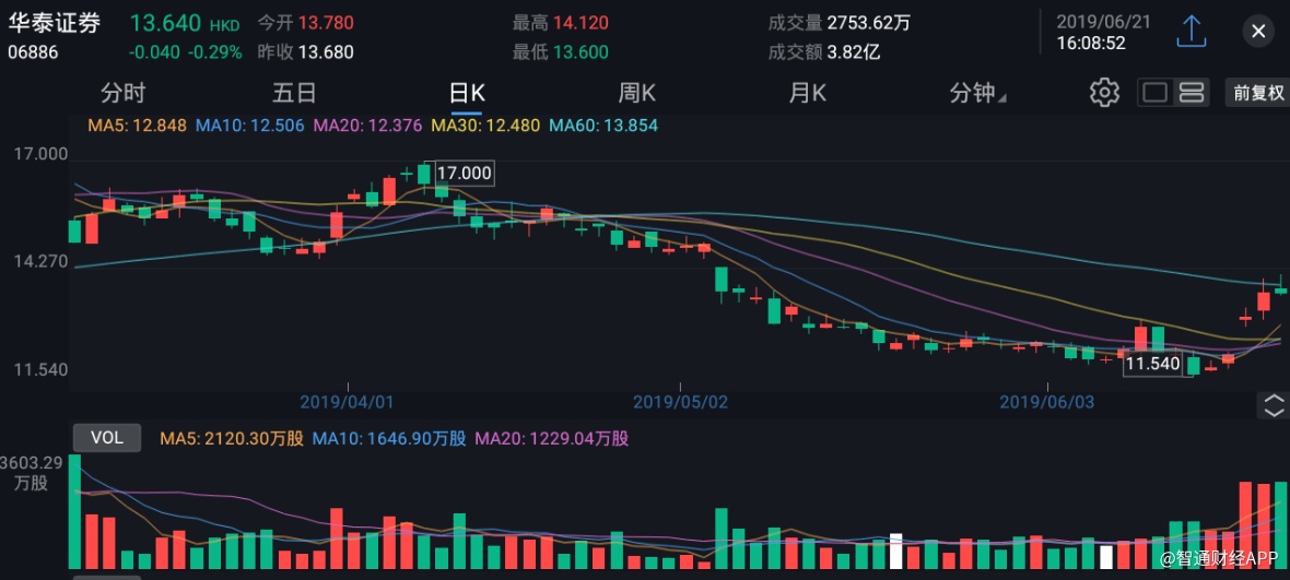 截至今日收盘,华泰证券(06886)跌0.29%,报13.64港元。