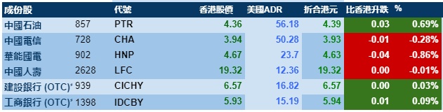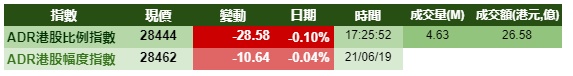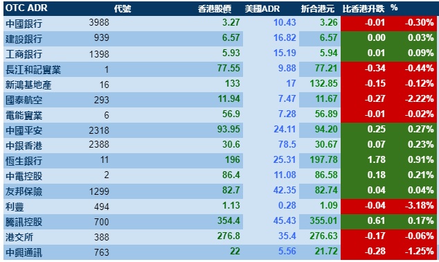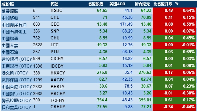 智通财经APP获悉,美股收跌,港股ADR指数表现偏软,按比例计算,收报28444点,降28.58点或0.10%。大型蓝筹涨跌各异,汇丰控股较港收市跌0.42港元,腾讯控股较港收市涨0.61港元。其他数据如下: