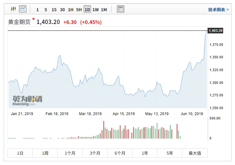 智通财经APP获悉,6月21日(周五),COMEX黄金期货收盘继续上涨,报1403.2美元,升至5年来高位,原因是投资者继续押注于美联储及其他央行将会放宽货币政策。