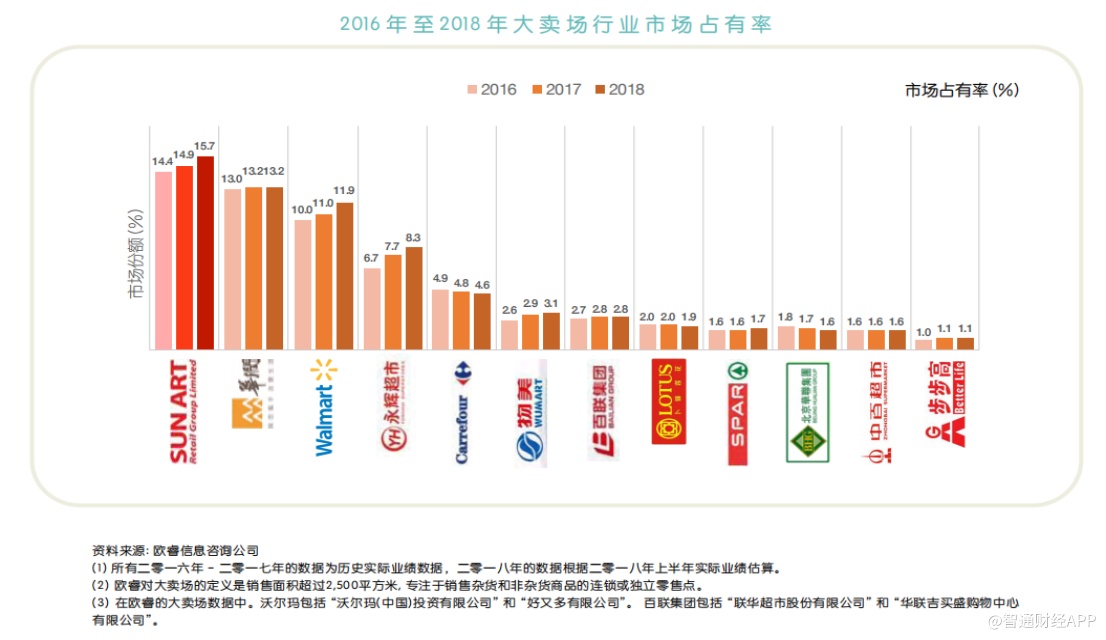 根据高鑫零售《2018年环境、社会及管制报告》,截至2018年12月31日,公司在中国共有484家大卖场,覆盖全国29个省级行政区的233个城市,2018年公司在中国大卖场行业的市占率为15.7%。相较于2016年在中国大陆共有446家大卖场及超市,覆盖224座城市,以及在中国大卖场行业14.4%的市占率。从门店数量上看,高鑫近三年的发展并不能用“高歌猛进”来形容。