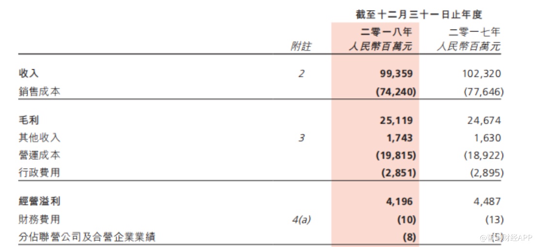 2018年,高鑫零售实现收入993.59亿元人民币(单位下同),同比下滑2.9%,公司营运成本却达到198.15亿元,增幅为4.7%,运营开支占收入比重达到19.9%,同比增长1.4个百分点。公司称,该增加主要由于门店数目随持续扩张的大卖场网络而相应增加及O2O业务发展所致,该等项目需投资人事及其他有关项目,此外由于公司根据政府指导提高最低工资标准,人事开支、经营租约开支、土地使用权的摊销、物业、厂房及设备的折旧以及其他经营开支有所上升。