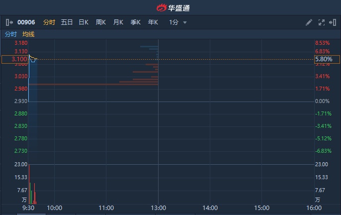 智通财经APP获悉,中粮包装(00906)早盘平开后直线拉高,截至9时38分,涨5.8%,报3.1港元,成交额达658.1万港元。