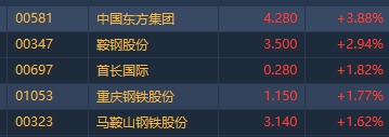 智通财经APP获悉,钢铁板块个股早盘悉数回暖反弹,截至发稿,中国东方集团(00581)涨4.61%,鞍钢股份(00347)涨2.94%,马钢股份(00323)涨2.27%,首长国际(00697)、重庆钢铁(01053)涨近2%。