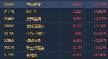 智通财经APP获悉,物业管理板块早盘普涨,截至发稿,中海物业(02669)张5.74%,报4.42港元,创历史新高,彩生活(01778)涨4.82%,奥园健康(03662)、碧桂园服务(06098)涨超3%。