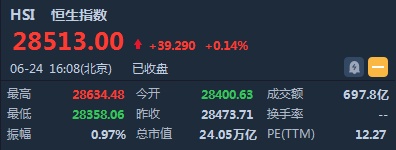 智通财经APP获悉,恒指早盘低开0.26%,报28400.63点。截至收盘,恒生指数涨39.29点或0.14%,报28513点,全日成交额达697.82亿。国企指数涨0.29%,报10952.94点,红筹指数涨0.22%,报4426.14点。
