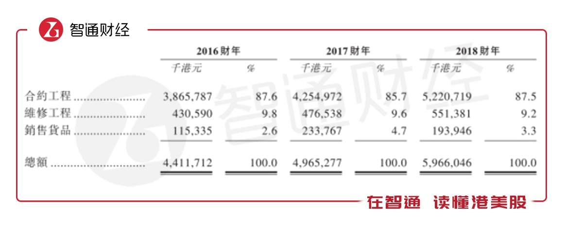 在公司的各项业务中,主要靠按项目基准承包服务、提供运营及保养服务、销售货品等3项获得收益。以合约工程为主要收入来源,近三年承包项目服务所获得的收益占比均维持在85%以上。