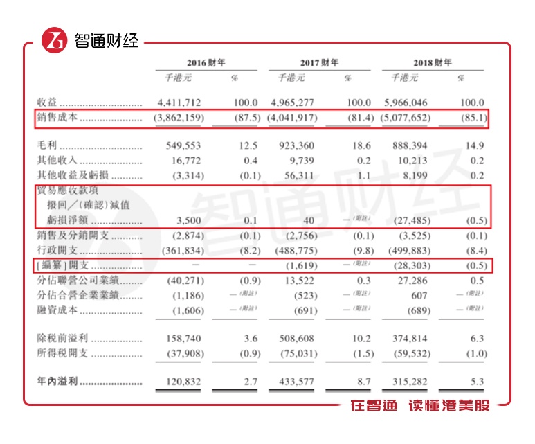 公司贸易应收款项拨回╱(确认)减值亏损净额于2018年出现大幅增长,由17年的4万港元增长至18年的2748.5万港元,增幅688倍。据该公司在招股书中提到,此项减值亏损净额主要来自若干客户应收贸易款项所确认的亏损,有关款项视为不可收回。