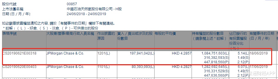 智通财经APP获悉,根据联交所资料显示,摩根大通于6月18日减持中石油(00857)1.98亿股,每股作价4.2857港元,总值约8.49亿港元,最新持股数目约10.85亿股,最新持股比例为5.14%。