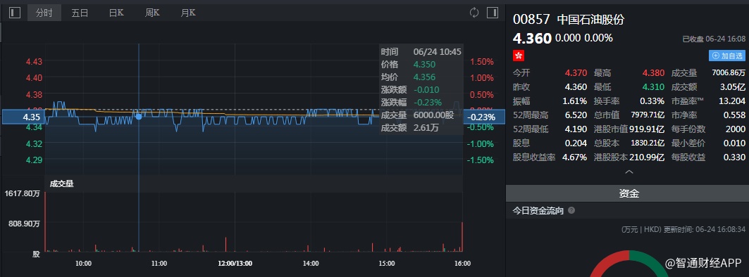 截至今日收盘,中石油(00857)无涨跌,报4.36港元。