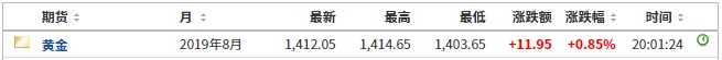 随着全球央行宽松周期重启,助力金市走高,或预示黄金牛市到来。截至发稿,黄金期货涨0.85%,报1412.05美元。