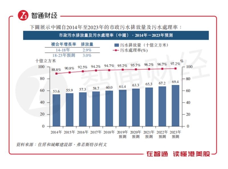 根据弗若斯特沙利文报告,随着城镇化进程加快及用水需求不断增加,市政污水排放量于2014年至2018年以2.9%的复合年增长率增长,于2018年达约600亿立方米。因此,随着中国市政污水处理能力及处理量不断提升,市政污水处理率从2014年的88.8%大幅增至2018年的94.7%。伴随城镇化推进、人口增长及经济发展,从2018年至2023年,预计市政污水排放量将以3.0%的复合年增长率增长。